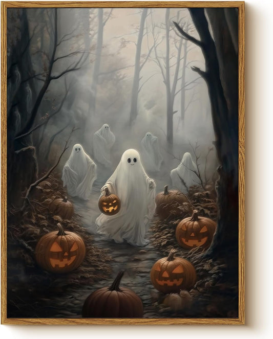 Autumn Ghost Halloween Canvas Wall Art,Umbrella Ghost in Golden Fall Leaves Rain Haunted Forest Rustic Poster,Whimsical Yard Decor Print,Dark Academia Halloween Wall Decor,16"x24" Unframed