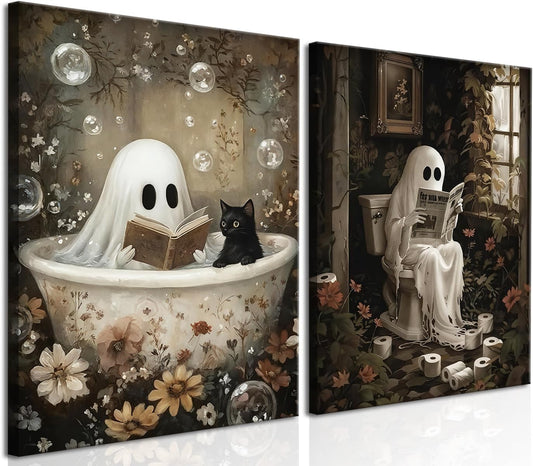Halloween Ghost & Cat Bathroom Wall Art Set - Gothic Decor 12x16 Framed