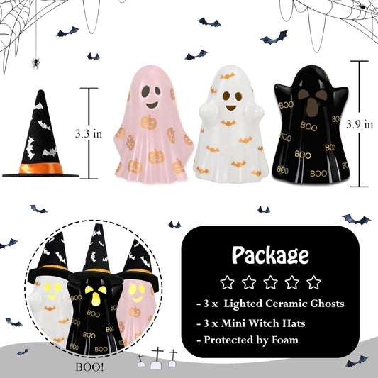 3-Piece Lighted Ceramic Halloween Ghosts with Witch Hats for Indoor Decor